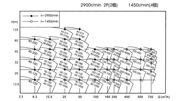 全系列共67個品種,184個規(guī)格,其性能范圍:流量6.3~1080m3/h,揚程12.5~125m,配用電機功率0.37~160kw,轉(zhuǎn)速1450r/min和2900r/min。